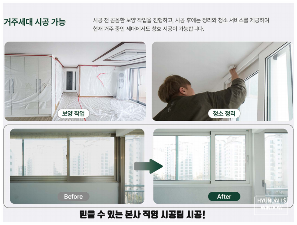▶ 현대 본사 직영 시공팀이 직접 시공하며, 시공 후 창호의 개폐 상태, 프레임과 창짝의 균형, 손잡이 작동 여부 등을 꼼꼼히 점검하여