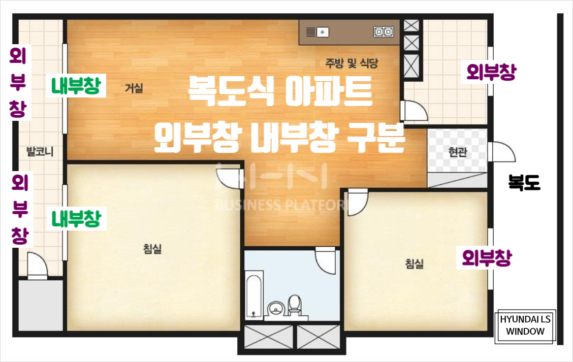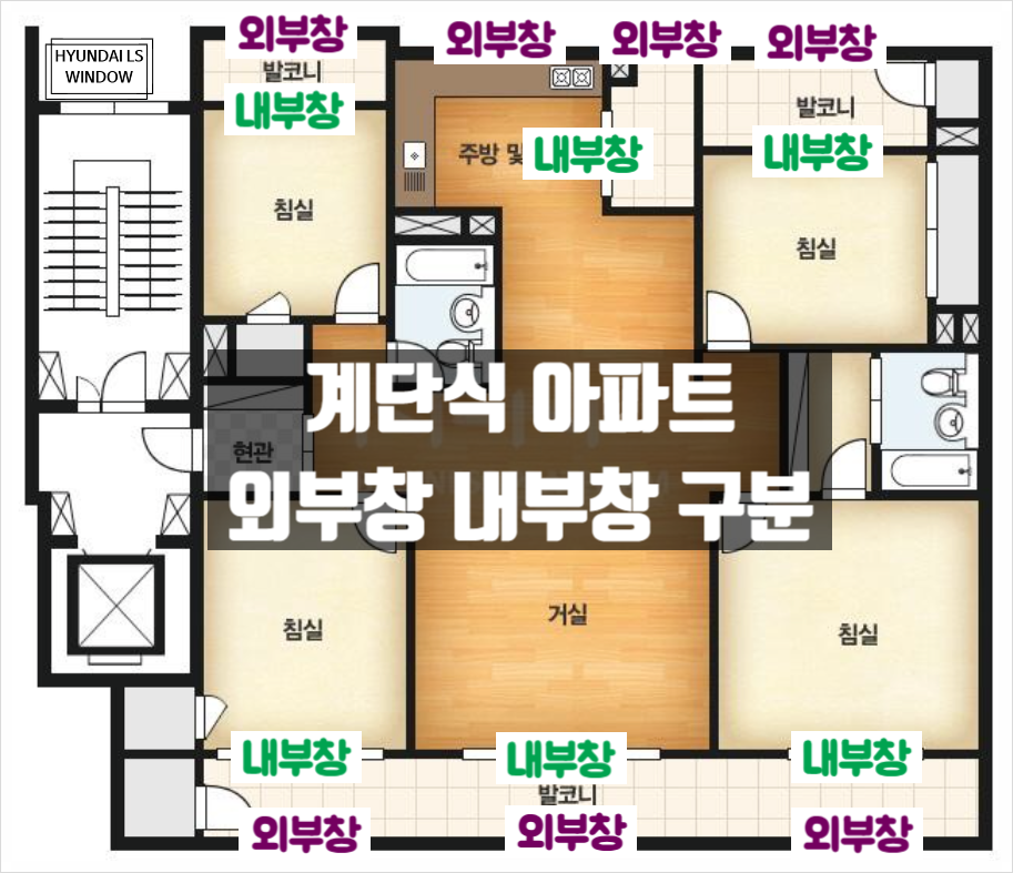 ※ 외부창: 외기에 바로 접하는 창. 단열에 핵심적인 창 입니다. 발코니 전용창을 사용합니다. (예: 거실 발코니창, 쉽게 생각하시면 비오면 비맞는 창은 다 외부창 입니다. 복도식 아파트의 경우 복도쪽 방 창도 비맞지는 않지만 외기에 바로 접하는 창이라 외부창 입니다.)