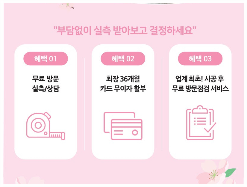 다양한 금융 상품으로 월 10만 원~30만 원 대로 시공 가능하니 문의 바랍니다.