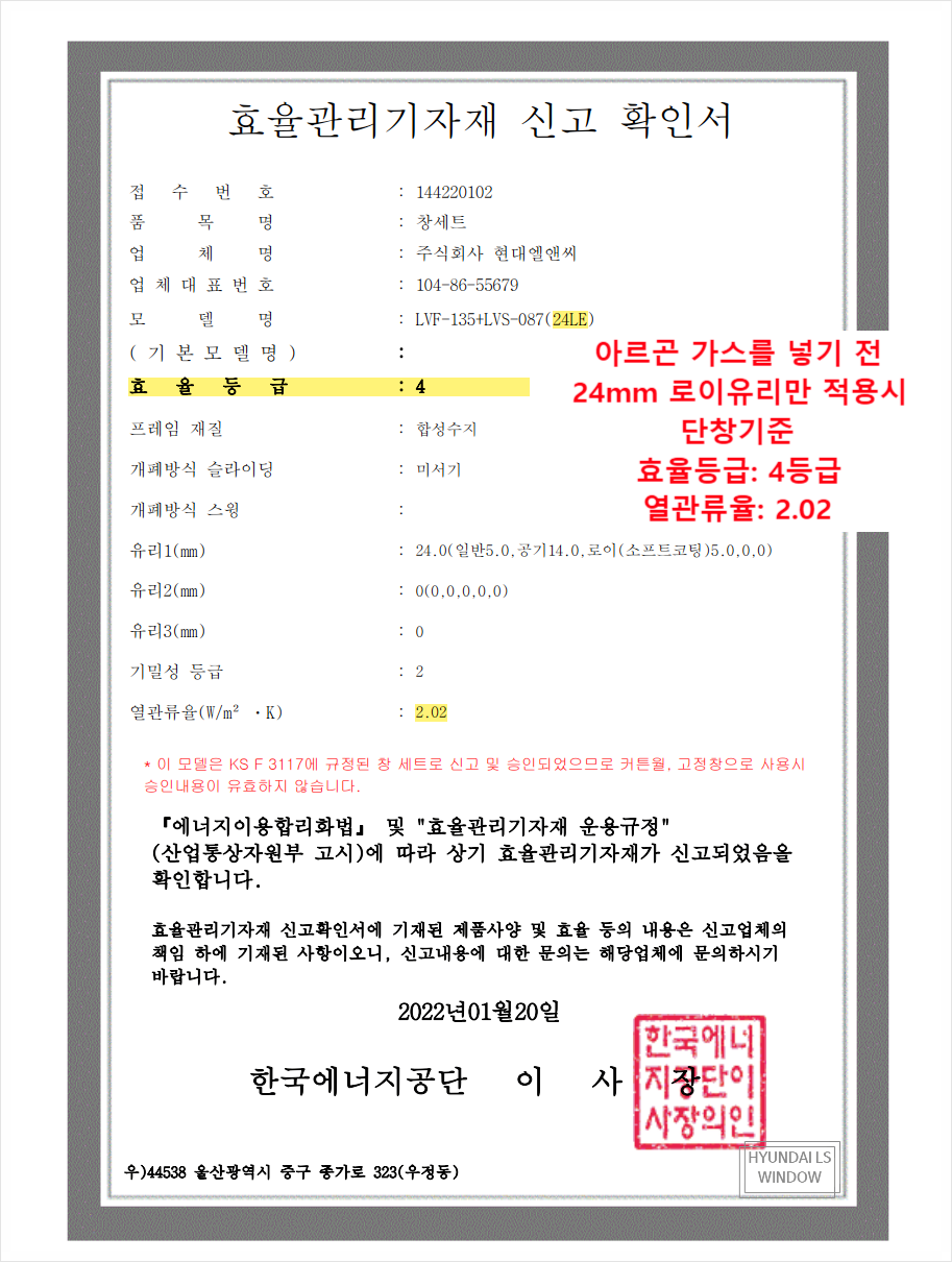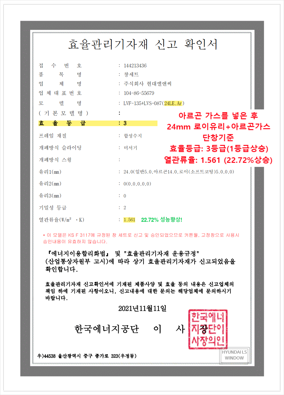 고성능 창호에는 아르곤가스 주입이 거의 필수로 적용됩니다.