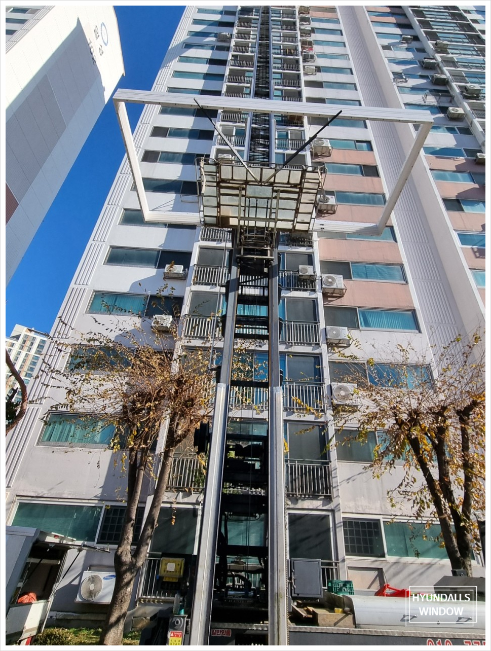 사다리차 양중은 무거운 창호 자재를 고층까지 안전하고 효율적으로 운반하기 위한 방식으로, 큰 창호는 좁은 계단이나 엘리베이터 진입이 어렵기 때문에 창호 시공시 가장 일반적이고 신속한 운반 수단으로 사용됩니다.