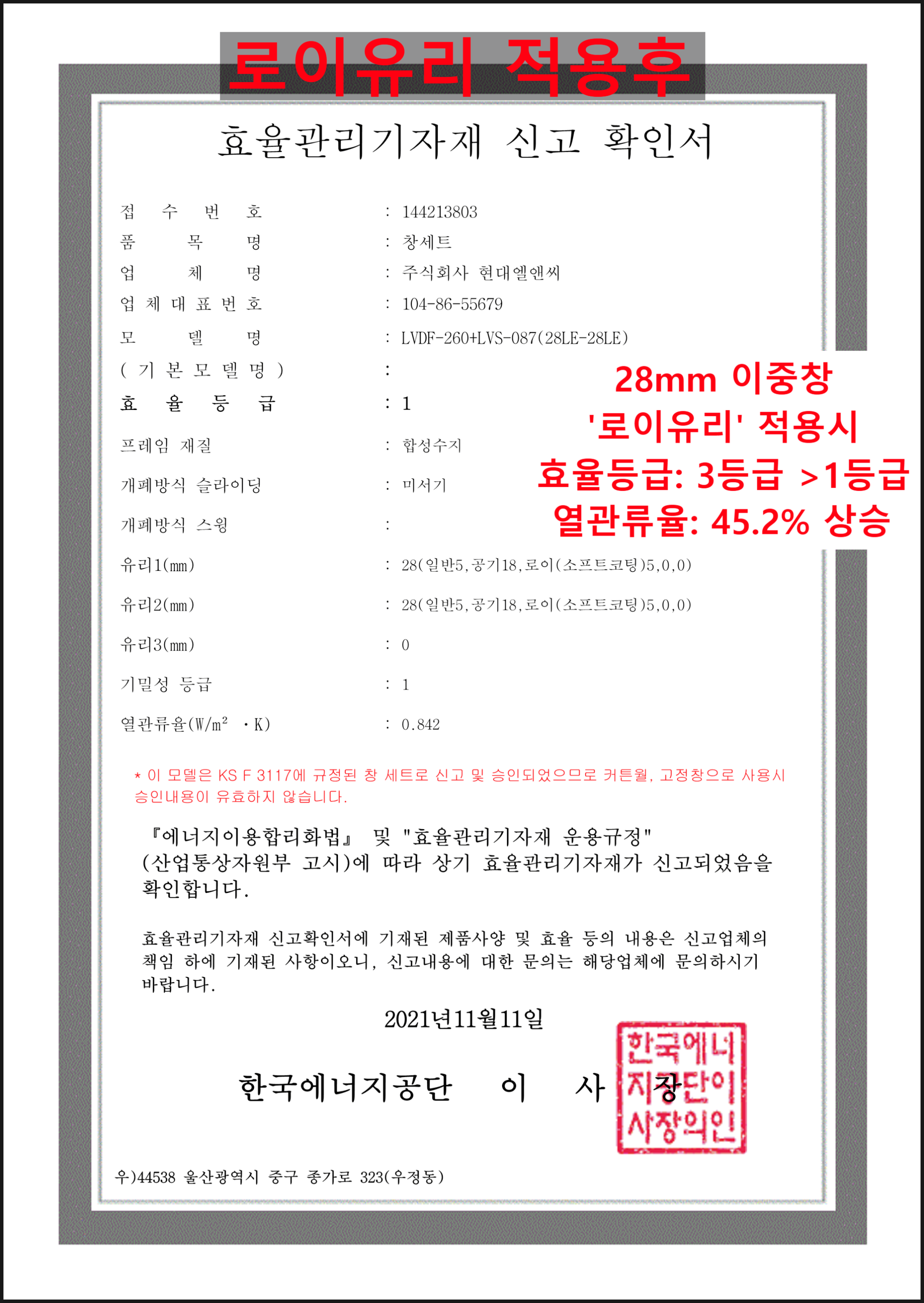로이유리를 적용하면 에너지 효율 등급이 3등급에서 1등급으로 향상되며 단열 성능은 40% 이상 개선되는 효과를 기대할 수 있습니다.(*이중창 기준)